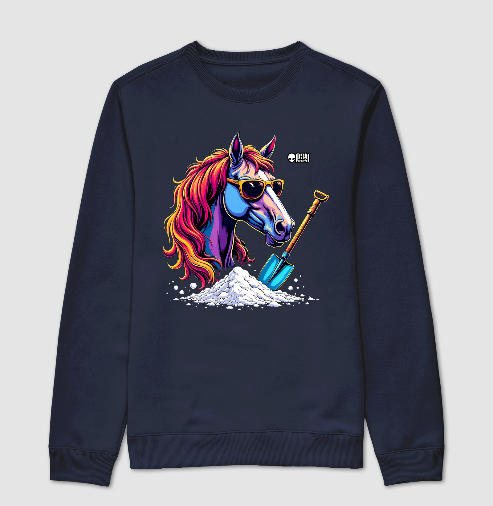 Imagine um cavalo de boa, curtindo sua vibe, quando se depara com uma montanha branca à sua frente e a única coisa ao seu redor é uma pá de obra. Ele olha pra cena e pensa: “E agora, o que eu faço?” Com uma dose de sarcasmo e estilo descolado, essa estampa é ideal para quem quer levar estilo e humor em doses cavalares pra qualquer lugar. Capaz de arrancar gargalhadas de seus amigos, essa camiseta é a junção perfeita do divertido e do ousado.