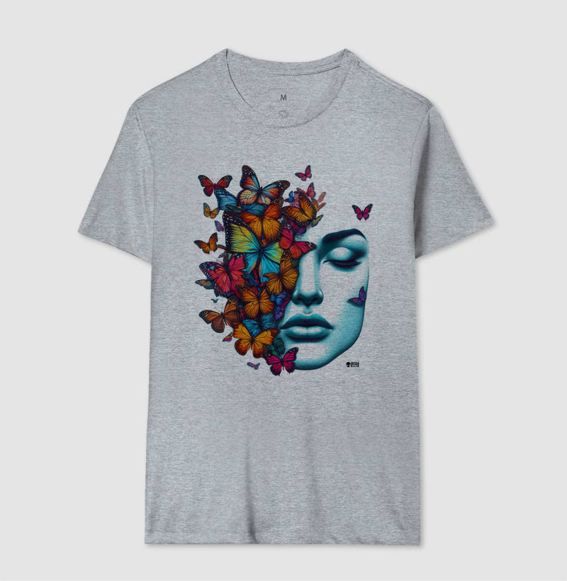 Imagine uma camiseta que é um manifesto da transformação e da beleza efêmera, com um rosto feminino em metamorfose, envolto por um frenesi de borboletas. Nesta estampa, a figura feminina se transforma, sutilmente, em um caleidoscópio de borboletas em voo. Cada asa que emerge é uma expressão da liberdade e da metamorfose, um convite para dançar na sinfonia da mudança. É como se as borboletas fossem mensageiras de renovação, suas cores e padrões representando o potencial de reinvenção e crescimento. Vestir essa camiseta é abraçar a beleza da transformação, celebrar a capacidade de se renovar, e deixar que a delicadeza das borboletas inspire uma jornada de autodescoberta e evolução pessoal.