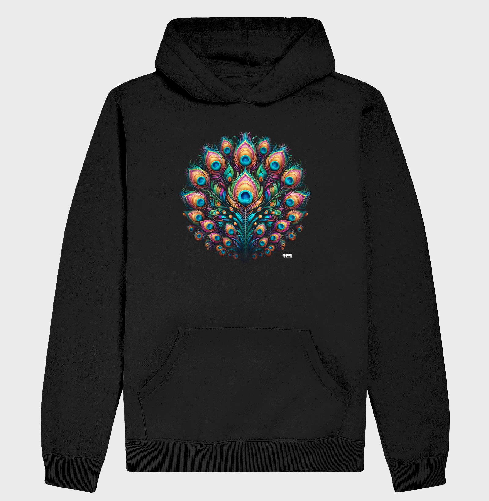 No centro da visão, uma mandala hipnótica se expande em espirais de penas de pavão, cada uma vibrando em cores iridescentes como olhos cósmicos que tudo observam. A simetria é sagrada, mas viva — pulsa como se respirasse, conectando beleza, mistério e transcendência em um só fluxo visual. Mais que uma estampa, é um portal vestível, que te posiciona no meio do universo: calmo, psicodélico e em pleno estado de presença. Ideal para quem sabe que o verdadeiro luxo é estar desperto.